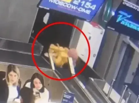 ロシアの空港で女性が預け荷物のコンベアを歩く衝撃的な出来事が発生、無事に救助される。