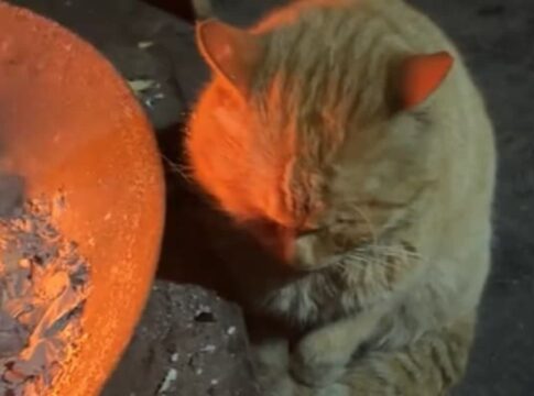 寒波の中、暖炉の前で眠る猫の姿がSNSで話題に。眠気に勝てず頭を垂れたまま寝入る様子が可愛い。
