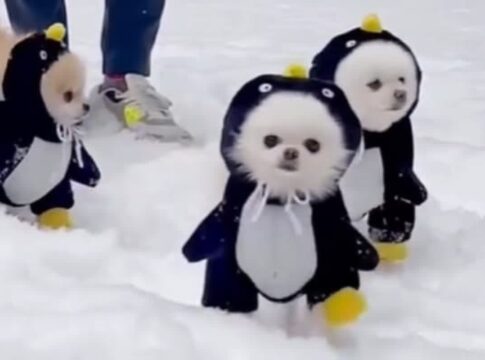 雪の日にペンギン服を着た犬たちが遊ぶ姿がSNSで話題に。愛らしい光景が心を癒す。