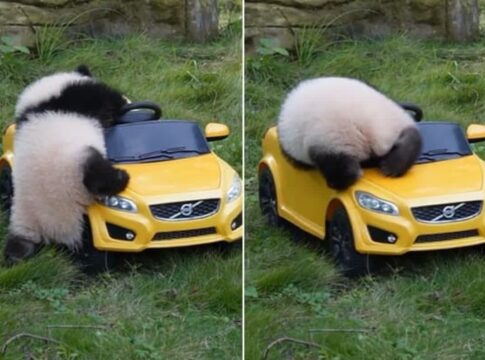 赤ちゃんパンダが短い足で車に乗ろうと奮闘し、自力で成功する姿が愛らしいと話題に。