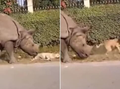 子犬が眠っていると、巨大なサイが近づき驚かせる。その瞬間の驚愕の表情が話題に。