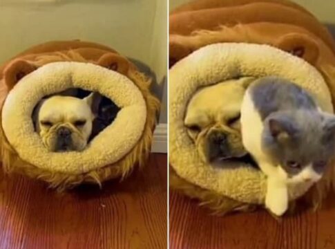 猫のハウスに犬が無理やり入り、おならをしたことで猫たちが驚いて飛び出す様子が話題に。
