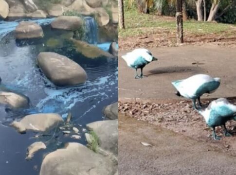 ブラジルの湖が染料で青く染まり、環境当局が動物の救助と浄化作業を行っている。