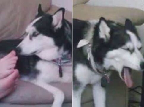 シベリアンハスキーが飼い主の足の臭いを嗅ぎ、驚きの表情を見せる様子が話題に。