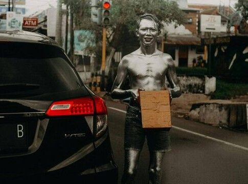 インドネシアの「シルバーマン」が路上で物乞いをし、恥ずかしさを感じながらも家族のために働く様子を取材。