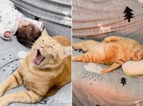猫が育児を手伝うも、疲れてソファで寝てしまう姿が愛らしい。育児の大変さを実感する瞬間。