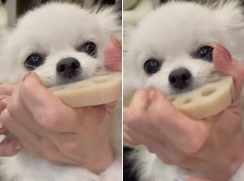 ポメラニアンが蓮根を口にくわえ、飼い主との攻防戦が繰り広げられる様子が話題に。