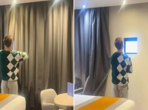 ホテルのカーテンの向こうに小さな窓が隠れており、驚きのインテリアが話題に。