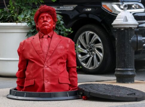 ニューヨークにトランプ大統領の赤い彫刻が設置され、話題に。作者は強烈な対比を表現したと語る。
