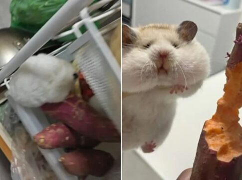 キッチンでさつまいもを盗み食いしたハムスターが捕まる様子が可愛すぎて、飼い主も笑ってしまった。