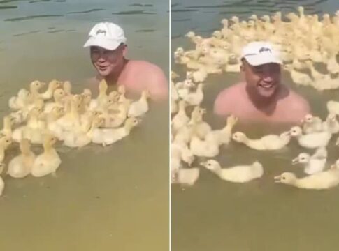 暑さをしのぐため水に入った男性が、アヒルのヒナたちに囲まれる驚きの瞬間がSNSで話題に。