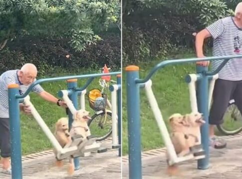 おじいさんが公園で愛犬たちをウォーキングマシンに乗せ、楽しむ微笑ましい光景がSNSで話題に。
