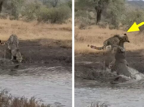 水たまりでチーターが捕食者のワニに襲われる緊迫した瞬間を描いた生存のドラマ。