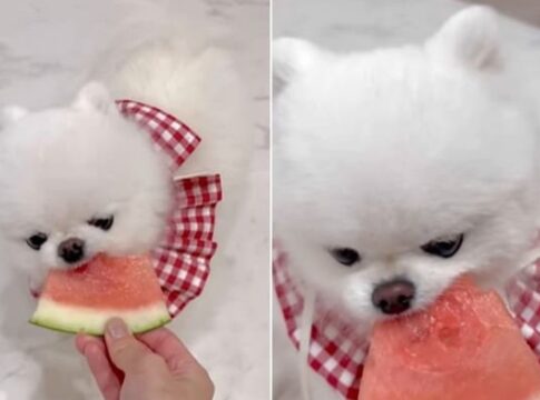 「これこれ、この味!」スイカと格闘するちっちゃなポメラニアンに、世界中がほっこり癒された