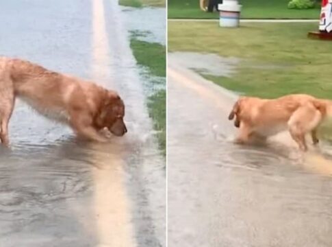 豪雨の中、ゴールデン・レトリバーが排水溝を掃除し、SNSで称賛の声が広がる感動の瞬間。