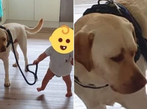 【胸キュン必至】よちよち歩きの赤ちゃんがリード持って散歩へ!?ラブラドールの"マジですか目"に世界中が爆笑&感動の嵐