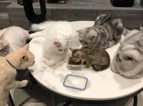 新しい子猫がご飯を食べると、先輩猫たちが集まり、監視する光景が話題に。猫たちの絆が感じられる。