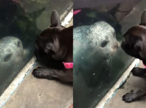 フレンチブルドッグのルーシーが水族館でアザラシと対峙し、ネットで話題に。ガラス越しの激しい神経戦。