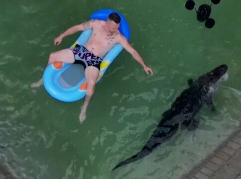【驚きのペット】2.4m巨大ワニと一緒に泳ぐ男性、30年以上の絆と信頼が育んだ特別な日常