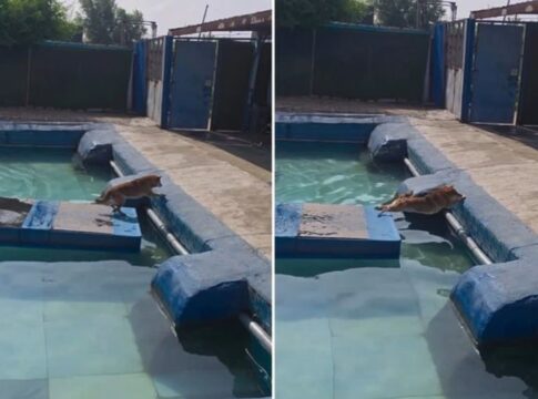プールで浮力板の上にいる犬が脱出を試みるも、思わぬ展開で水に落ちるが見事に泳ぎ上がる。