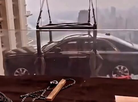 中国の億万長者が高級車を44階建てのペントハウスへ運ぶため、特注のケージで吊り上げた。