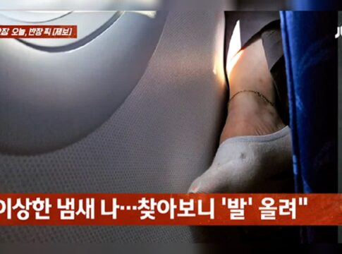 飛行機の中で靴を脱ぎ、前の座席に足を乗せる迷惑な乗客に遭遇したという話が話題となり、物議を醸している。提供者が当時の状況を撮影した写真。/写真=YouTubeチャンネル 『JTBC News』先月2日 ...