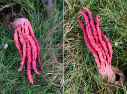 濃いピンク色で不気味な形状の「タコスッポンタケ」がイギリスで撮影され、強烈な悪臭を放つ。