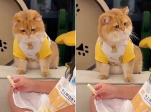 「私のおやつ食べニャイで!」子どもにおやつを奪われかけた猫、その必死の仕草と顔が可愛すぎて笑いが止まらない
