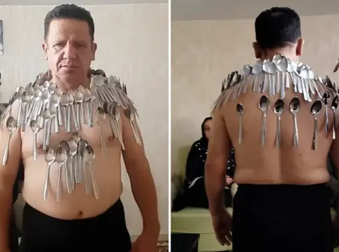 イランの男性がスプーン96本を体に載せる新記録を達成し、ギネスに認定された。