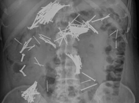 精神疾患を持つ33歳女性が大量の金属釘を飲み込み、保存的治療で回復した症例が報告された。