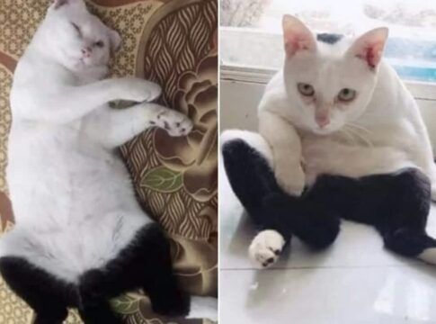 白い毛に黒い後ろ足を持つ猫が話題。まるでパンツを履いているような珍しい模様が注目を集めている。