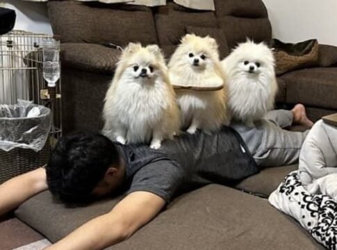 お父さんの背中に乗る三姉妹のポメラニアンたち。愛らしい光景が日常の一コマを映し出す。