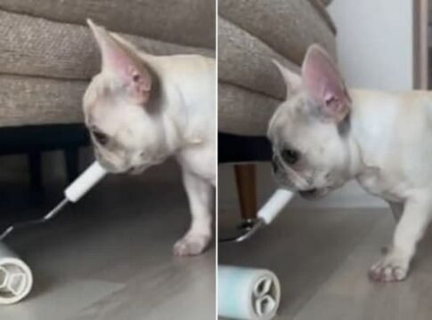 フレンチブルドッグがコロコロを使って掃除する姿が話題に。賢くて可愛らしい様子に多くの反響が寄せられた。