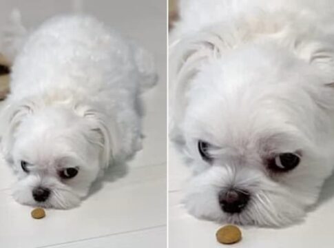 「誰にも渡さないワン!」たった一粒の餌を全力防衛...必死すぎる犬の「睨み」に爆笑の嵐