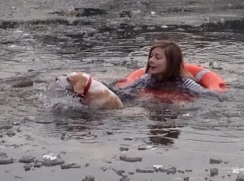 冬の湖で犬が溺れているのを見た少女が、躊躇なく救出に飛び込む勇敢な行動が称賛されている。