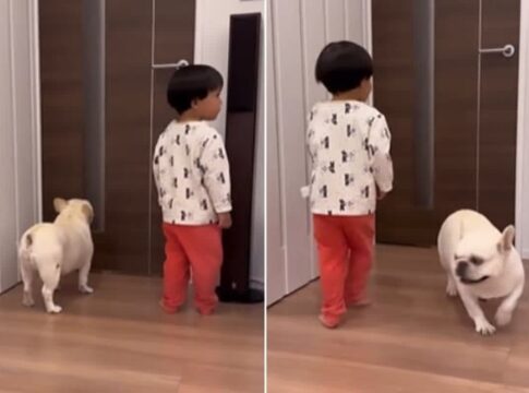 3歳の息子がフレンチブルドッグの行動を真似る様子が微笑ましく、見る者を癒す。
