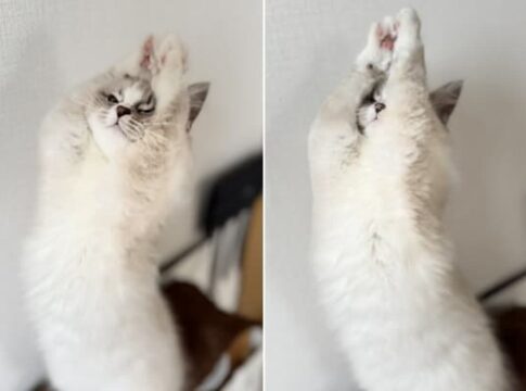 猫が突然二本足で立ち上がり、前足を空に向かって伸ばす愛らしい姿がSNSで話題に。