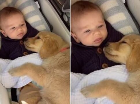 赤ちゃんを愛するレトリバー子犬がベビーカーに入り込み、心温まる姿を見せる動画が話題に。