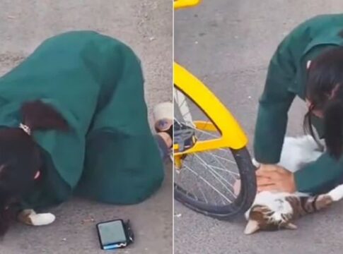 自転車にひかれた猫を救った女性獣医師が心肺蘇生を行い、猫が意識を取り戻した感動の瞬間。