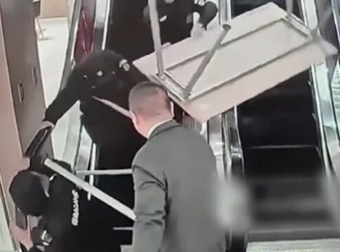 上海のショッピングモールで、エスカレーターでテーブル運搬中に事故寸前の危険な状況が発生。
