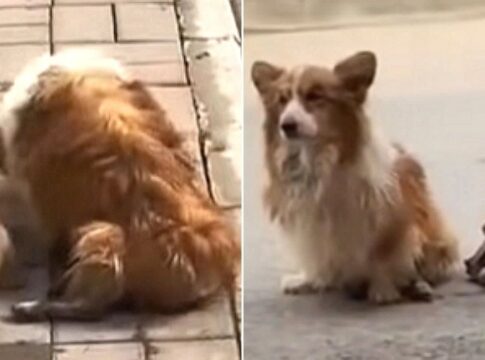 身体を引きずりながら食べ物を求めて歩くコーギー、その横には子犬が…心が痛む映像が拡散される