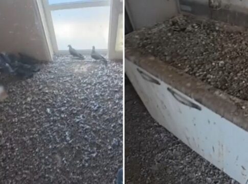 2年間鳩に占拠されたアパートの清掃が話題に。糞や羽毛が堆積し、住居としての機能を失っていた。