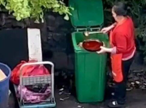 昼間に堂々と生ごみのごみ箱から「廃油」をすくう中国人、飲食店で再利用か?