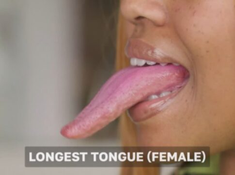 アメリカの女性が9.75cmの舌の長さでギネス記録を保持し、驚きの技を披露しています。