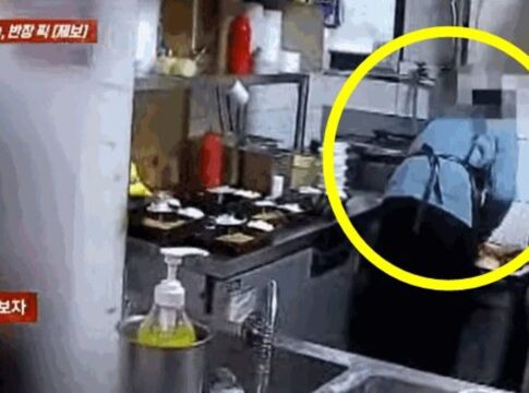 ソウルのトンカツ店で、ゴミ箱の上で食品を切り、配達員に渡す不衛生な行為が問題視されている。