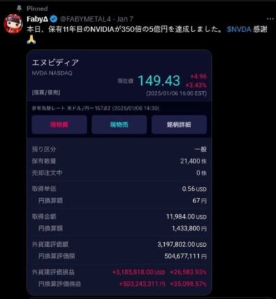 エヌビディア株を11年間保有した日本人が5億円の利益を得た話題が注目を集めている。