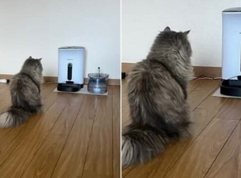 「この時間を待っていたにゃん…」自動給餌器の前で動かず待つ猫にネット悶絶!音に反応して飛んでくる姿が賢すぎると話題に