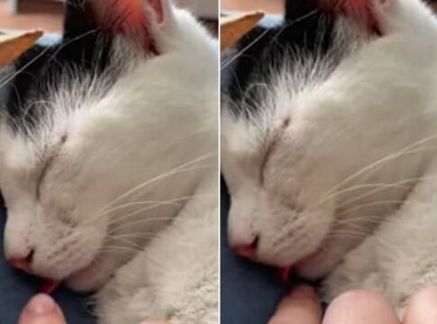 舌を出して眠る猫の可愛さが話題に。飼い主が触れると猫は反応しつつも、眠り続けた。