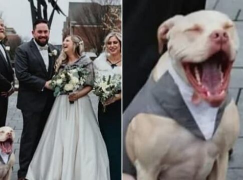 愛犬ウェラーが結婚式の写真であくびをし、新郎新婦よりも注目を集めたという心温まるエピソード。