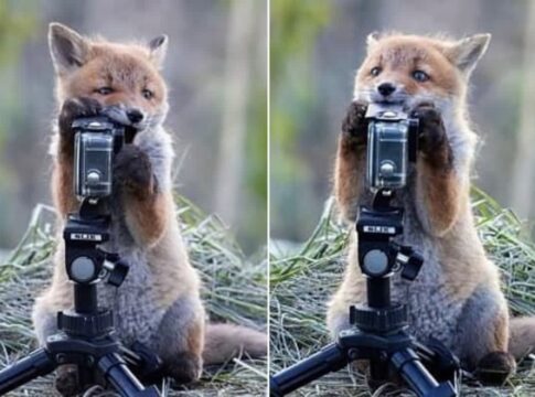 野生の子ギツネがカメラに興味を示し、無邪気に触ったり噛んだりする様子が話題に。